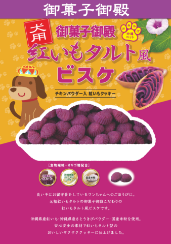 良い子にお留守番をしているワンちゃんへのごほうびに。 元祖紅いもタルトの御菓子御殿こだわりの紅いもタルト風ビスケです。